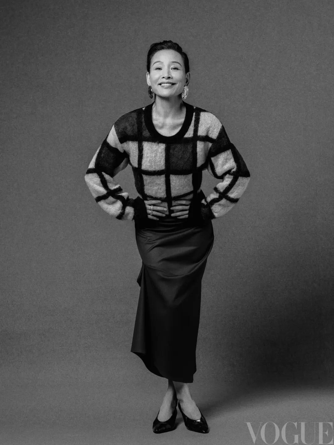 邬君梅:高领针织上衣、长裙、高跟鞋 均为Alaia