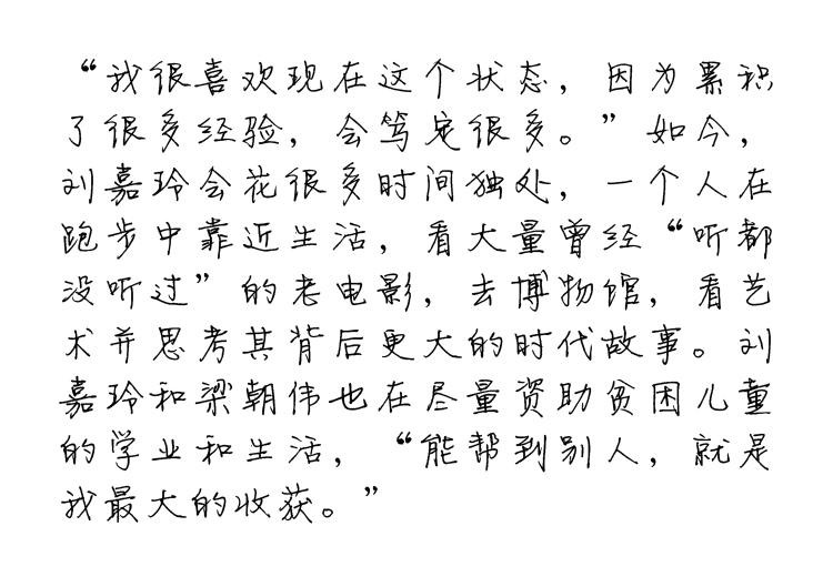 她的能量从哪儿来呢?出道后的刘嘉玲尽管塑造过许多经典角色,却数度错失香港电影金像奖,最终拿到奖时,所有人都替她高兴。她说,现在做事已经不再需要从别人那里获得肯定了,只需关注自己付出了多少时间和精力——也就是说,生命的重点已经从“得到”变成了“给出”。“付出”似乎是刘嘉玲的关键词,无论是对自己,还是对别人。付出,对她而言是收获。