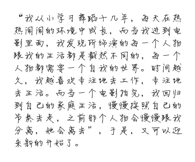 她这辈子只做了一件事,拍戏;自称是个没有副业的演员。演员的职业特性意味着她必须每天跟放大了的情绪打交道,微妙的情绪变化都能被镜头一一捕捉。随着时间,她愈发明白怎么管理情绪。“每一刻都会有不同的情绪。生活会不断甩给你不可想象的、难以预估的事,这些我们概念上的好与坏每天都在发生,这就是日子啊,日子就得细水长流地过啊……人就是在不断产生困惑和觉得自己解决困惑中来回。但现在三天前某个时刻的困惑,你已经想不起来,一笑了之了。”