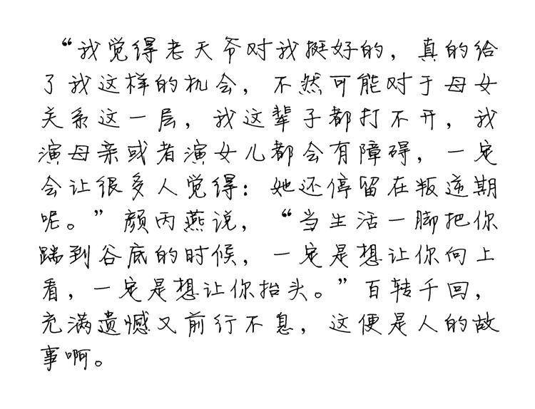 “我生活中没结婚、没孩子,可是我在戏里结了无数次婚,谈了无数次恋爱,生了无数个孩子,当了无数次妈妈。表演时经历的跟家庭跟丈夫的关系、对于爱情的理解……都会让我又打开了一个思维方式,又理解了一个人群。这种成长和成熟会神不知鬼不觉地加在你身上,让你觉得生命真有意思,人生真是美好。当你热爱这个工作的时候,它会给予你很多道不明但非常满足的感受”,颜丙燕说完用手指点点自己的心,这是她描述至深感受时喜欢做的动作。