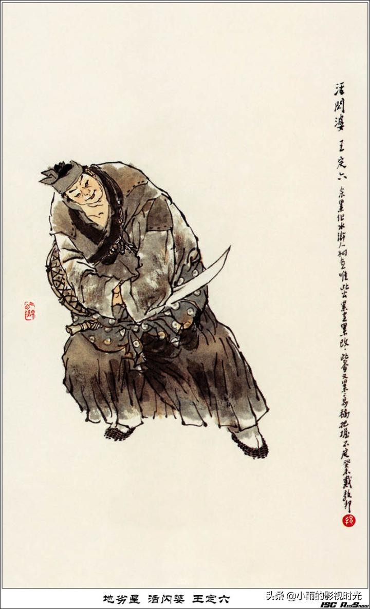 104地劣星 活闪婆王定六:征方腊时中毒箭而死。因行走迅速,得名活闪婆(即霍闪,闪电之意)。放现在,他就是一个向往强盗生活的小古惑仔,因崇拜梁山好汉随着张顺上山,连父亲都一块带上了。