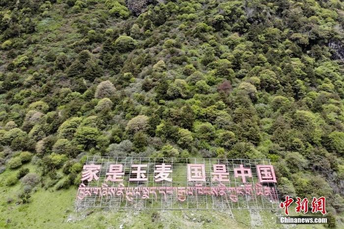 6月1日,记者探访西藏自治区山南市隆子县玉麦乡。玉麦乡位于西藏自治区山南市隆子县东北部边境地区,承担着守土固边的重要职责。玉麦乡是湖南省对口援助的乡村,这个曾经的“三人乡”已变成67户234人的小康示范乡。图为山间竖立着“家是玉麦 国是中国”的大字。(无人机照片) 中新社记者 杨华峰 摄