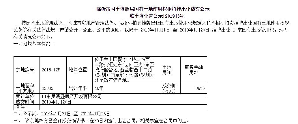 1月21日,临沂公共资源交易中心挂出一宗土地成交公示。位于兰山区聚才七路与临西十二路交汇处东北的一块商务金融用地,被山东罗滨逊房产开发有限公司以3675万元竞得。这起土拍也预示着,《临沂商谷片区核心区控制性规划》的实施,在2025年迈出实质性一步。