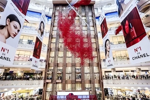 商场还不定期设置IP展览。譬如今年2023年的时尚IP展,以红色装置融入时尚艺术元素。