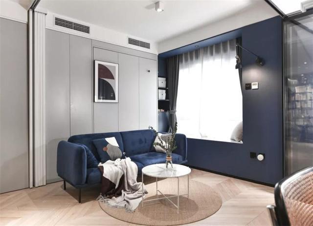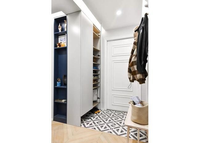 从玄关一直到客厅的墙面都被设计师改成了到顶的柜子,就像是做了一面木饰背景墙一样,显得简洁又舒适,灰色与蓝色的结合也非常好看。
