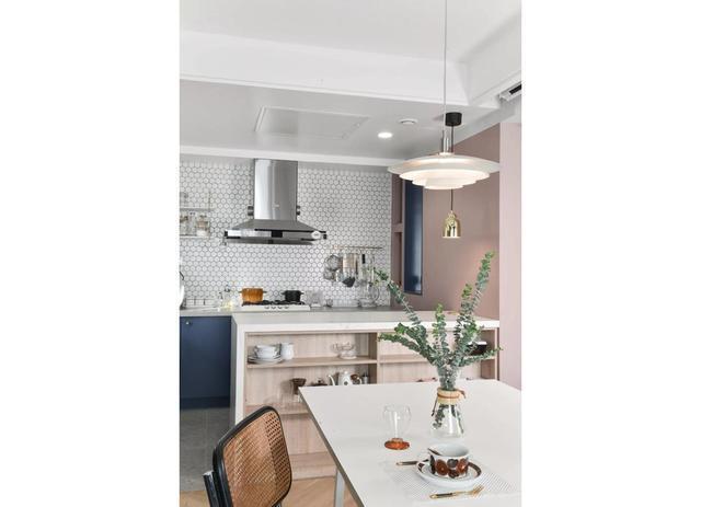 中厨和餐桌之间加上一个岛台,方便传递菜品,又能让餐厨多出一些储物空间,灶台左右不做吊柜,用更方便的挂杆、置物架代替。