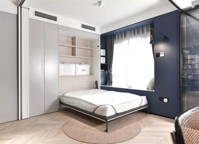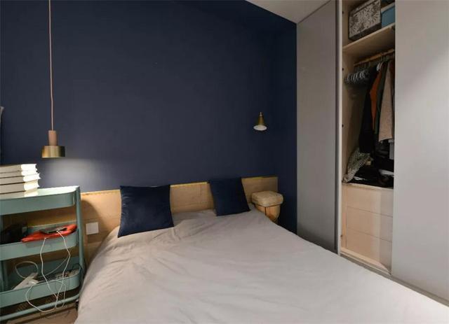 卧室的面积比较迷你一些,深蓝色的背景墙搭配白色的衣柜和床品,床头柜用小推车来代替,金属质感的吊灯增添了一些时尚感。