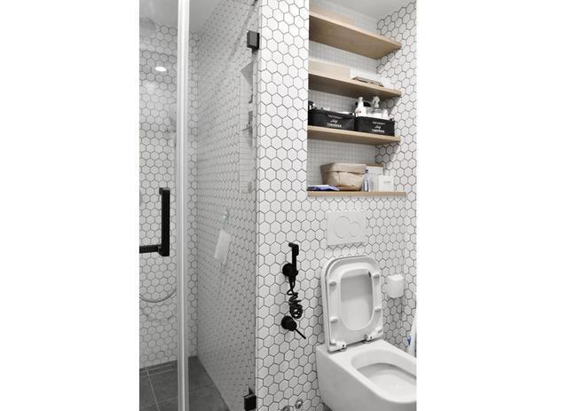 卫生间内部也把淋浴区和马桶分开了,独特的六边小砖搭配灰色调的地砖,整个卫生间给人一种文艺、轻松的感觉。