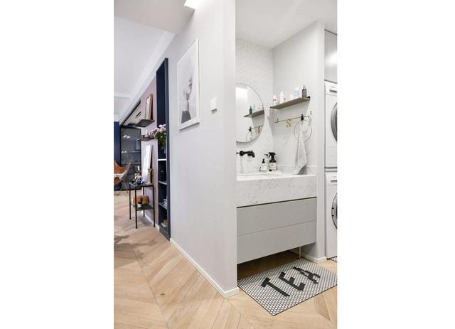 卫生间做了干湿分离的设计,设计师把洗衣台做进了一个凹槽空间,侧方摆放洗衣机和烘干机,大理石的台面非常好看。