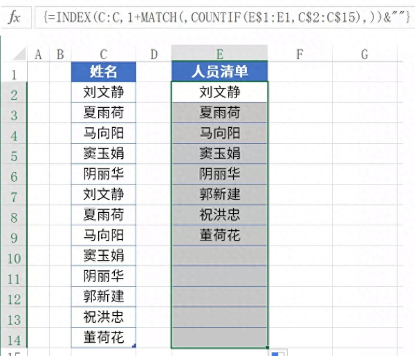 =INDEX(C:C,1+MATCH(0,COUNTIF(E$1:E1,C$2:C$15),0))&””