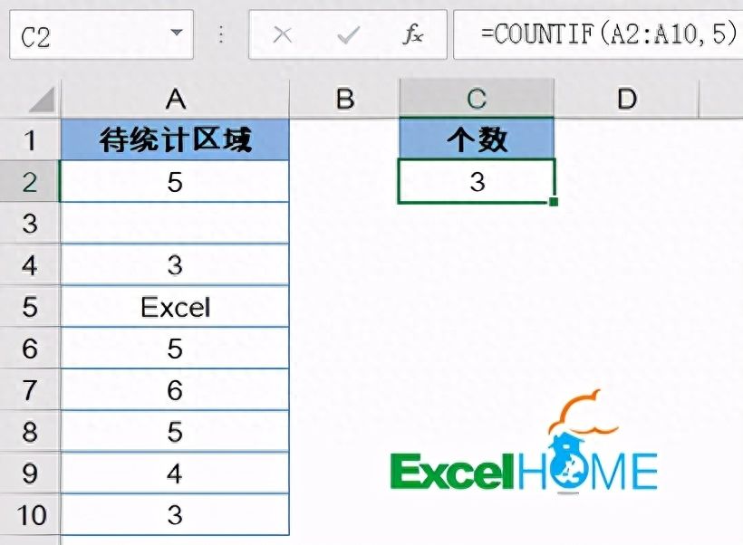 如下图所示,要统计A列有几个5,可以使用以下公式: