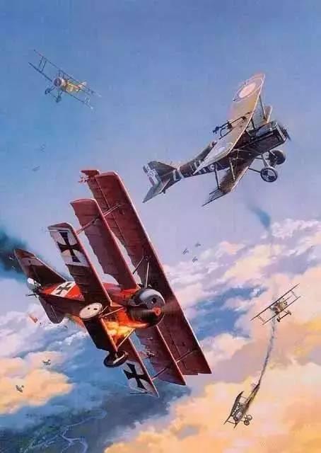 一战德国王牌飞行员曼弗雷德驾驶着编号425/17的福克DrI三翼机与协约国飞机交战