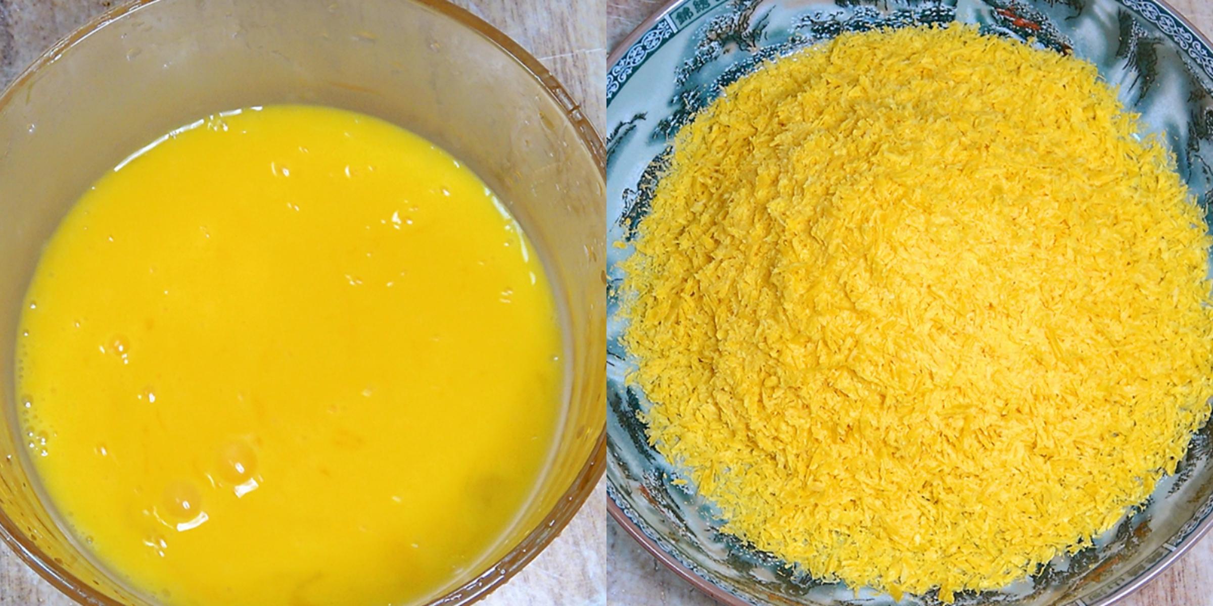 接着空碗里打入两个鸡蛋,用筷子打散,不用打得特别顺滑,只要把蛋黄和蛋白融合在一起即可。接着再准备一个空盘子,倒入一些黄色的面包糠,黄色面包糠炸出来会更好看。如果你是用的其他馅的汤圆,还可以加一些黑芝麻与面包糠混合,这样炸出来会更好看,而且带着芝麻香,汤圆会格外好吃一些。