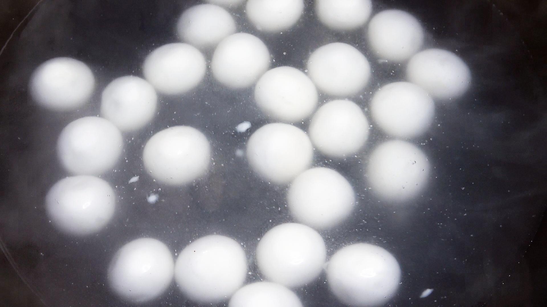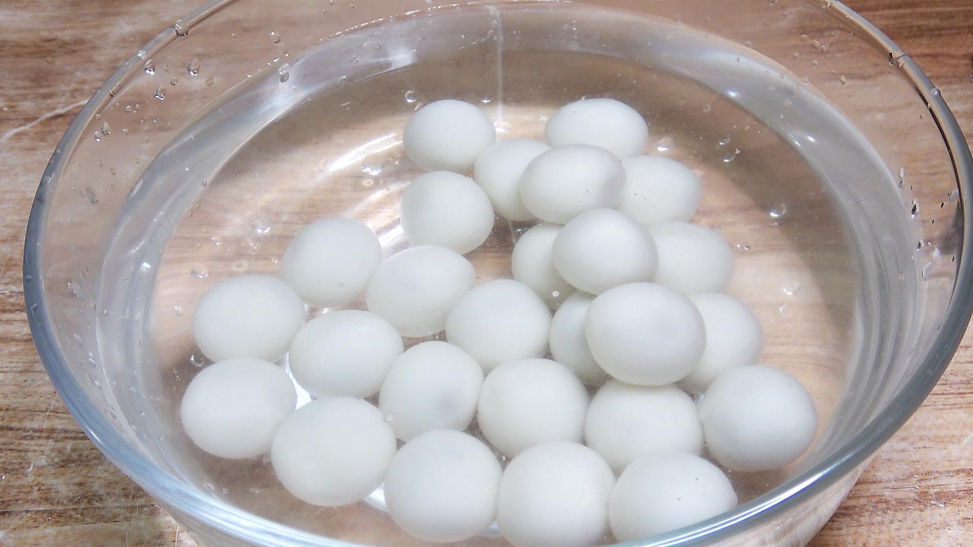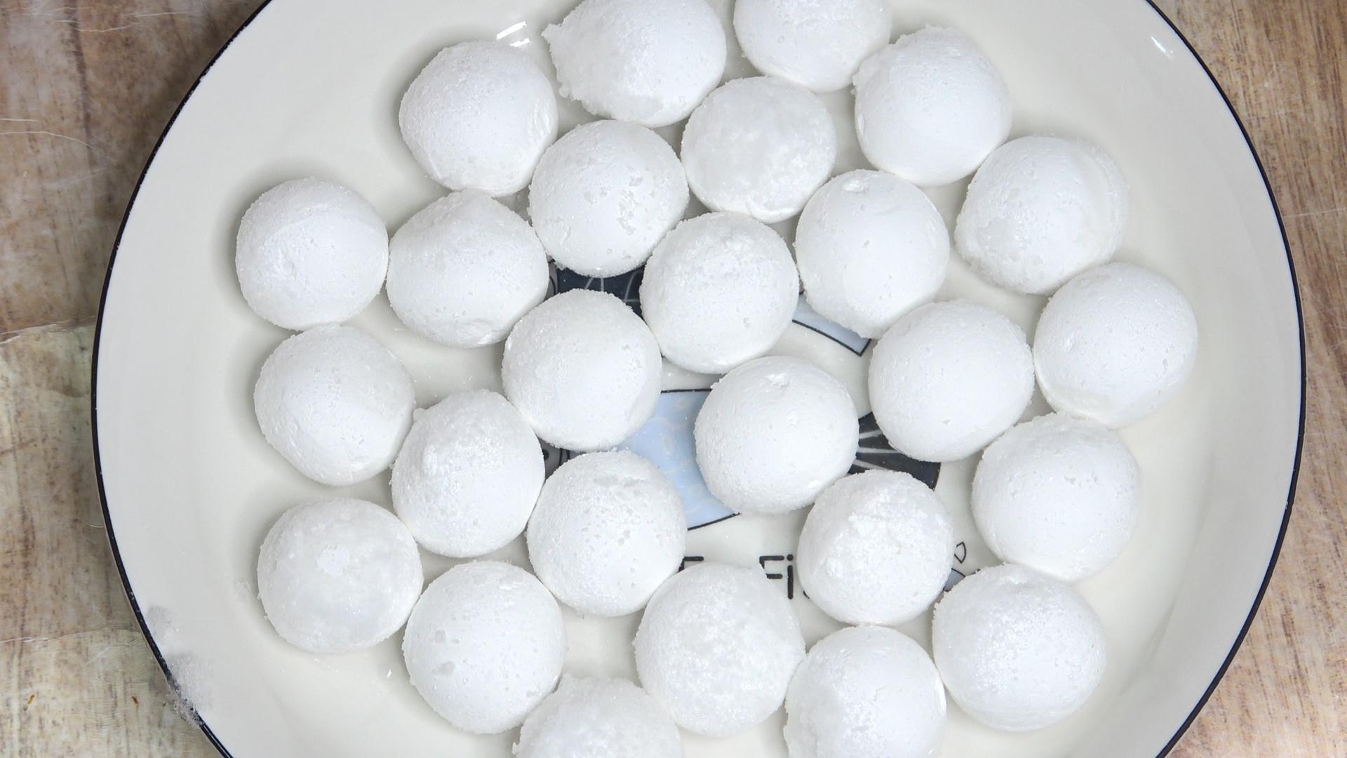 等到汤圆全部浮起来之后就可以起锅了。因为待会儿还要二次烹饪,所以煮到七八成熟即可。把煮好的汤圆起锅放入凉水里泡着,让汤圆彻底冷却。一定要把汤圆彻底放凉,这样汤圆才不容易破裂,这就是诀窍之一。用水泡着可以快速降温,而且汤圆之间不会粘在一起,也不会粘在碗底。