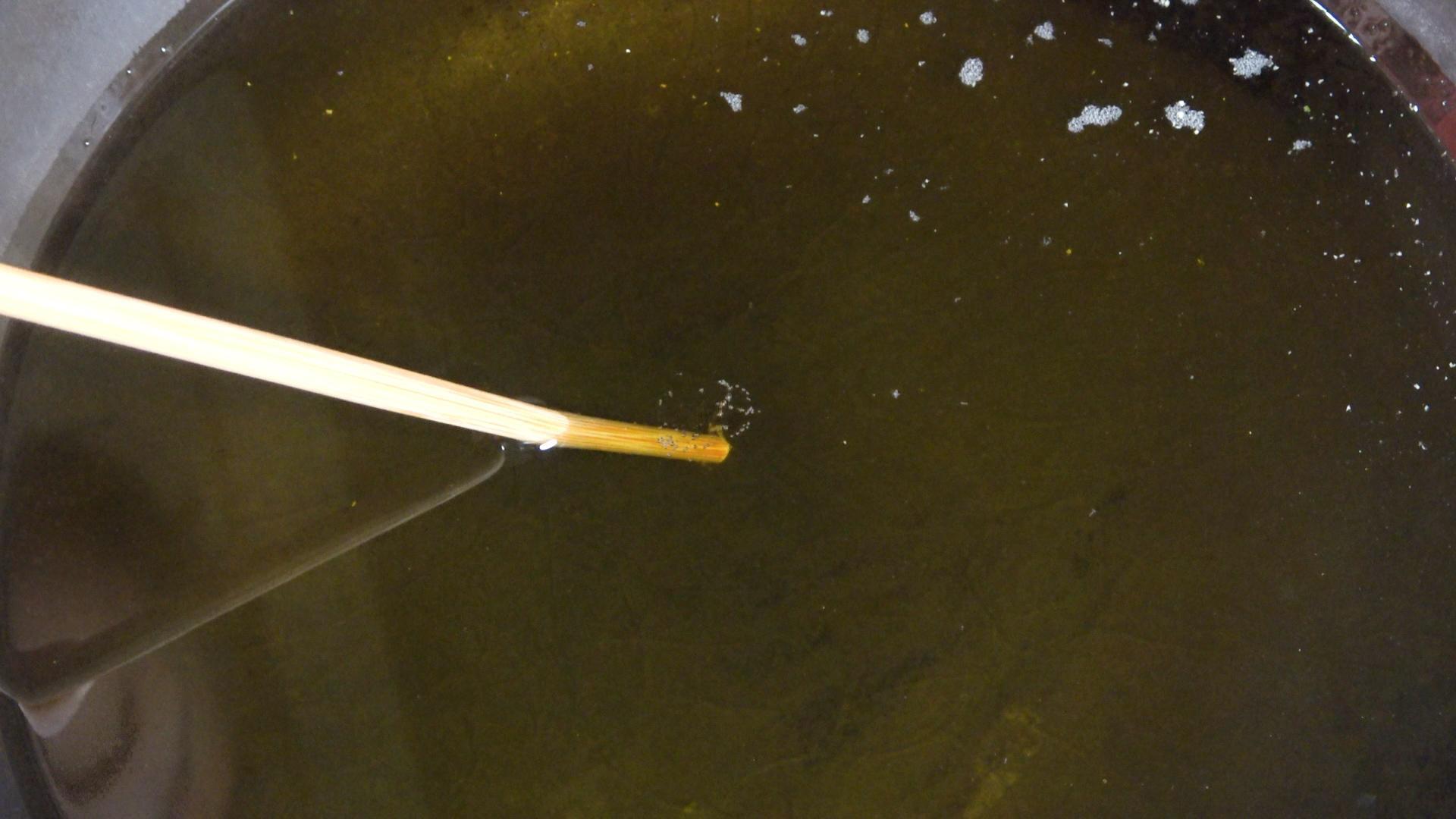 接着锅里加入宽油,用中火把油温烧到3成热,也就是筷子下锅之后会慢慢地冒一些小泡泡的时候就可以了。这时候把火调成小火,这就是诀窍之二,一定要低油温小火下汤圆,这样汤圆不会因为高油温迅速膨胀,汤圆自然也就不易爆裂了。把汤圆全部下锅,先炸个5秒钟。