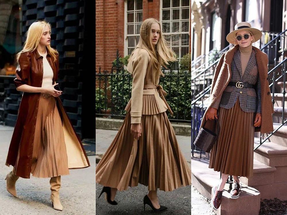 选择琥珀色系的长裙,可以融入细致的百褶纹理,百褶元素是从校园半身裙里延伸出来的,它的褶皱纹理之间可以感受到一丝减龄的气息,特别适合需要显年轻的穿搭。且百褶长裙又不会过于扮嫩,照样适合30岁以上的女性。