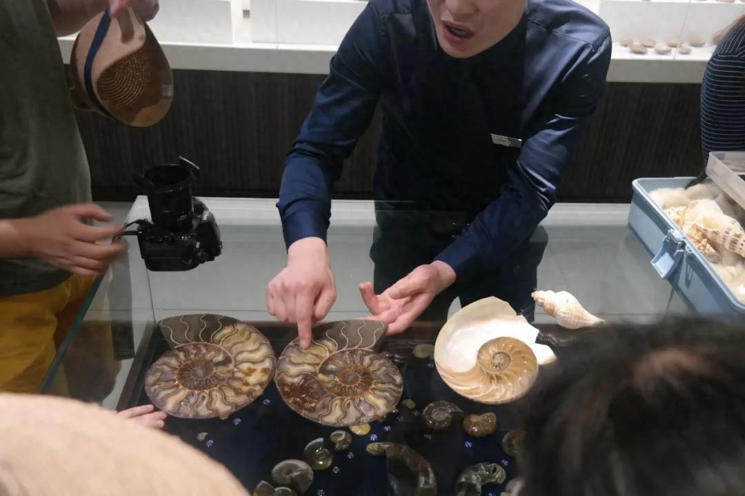 讲解员小哥正在给大家讲解鹦鹉螺的知识: