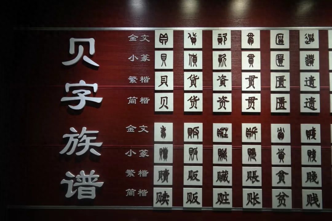 博物馆里展出的“贝字族谱”很有意思,听听讲解员的讲解,就能知道原来古代的字(金文)就跟画一样,有着形象的意思。