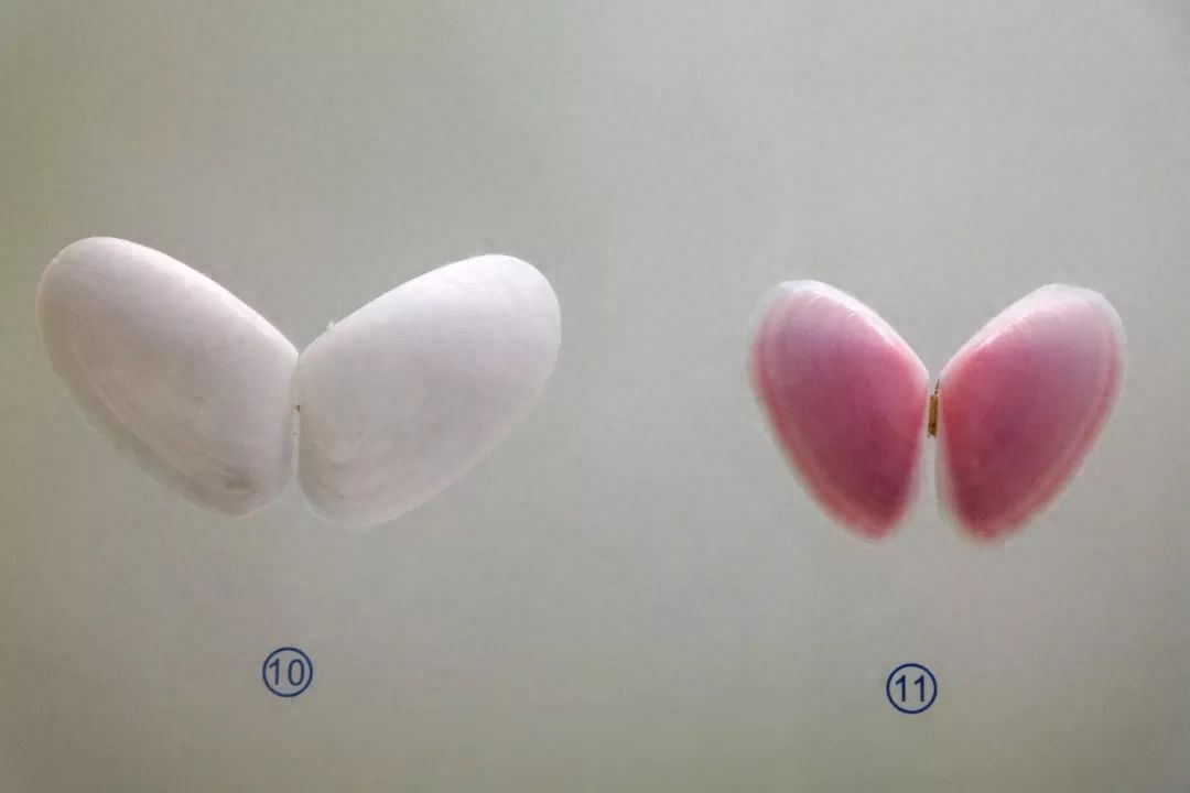 美容海扇蛤、光荣海扇蛤:不知道为什么会起这么个名字。我觉得像两只蝴蝶:一只白蝴蝶、一只粉蝴蝶。