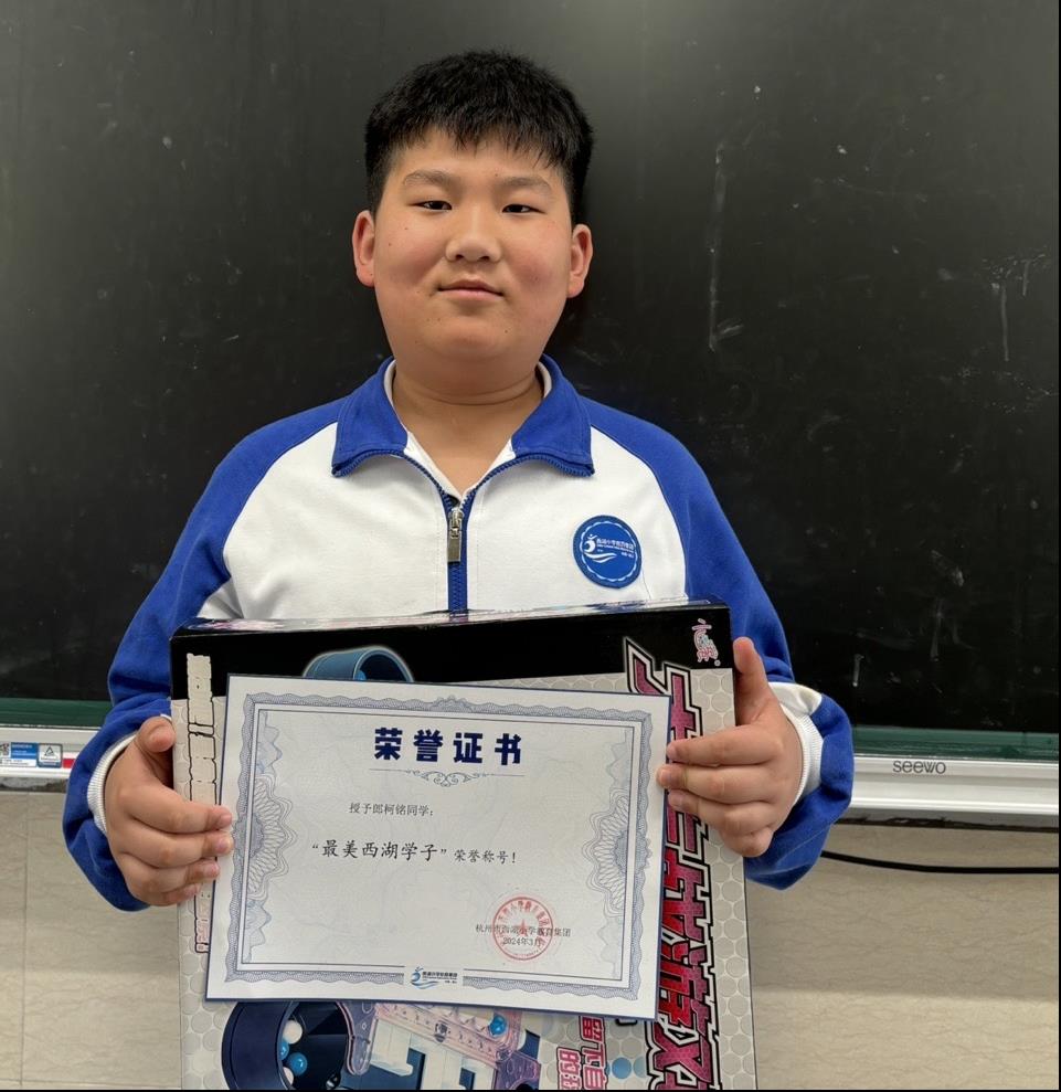 捧着写有“最美西湖学子”的奖状,这个小男生还略带羞涩。