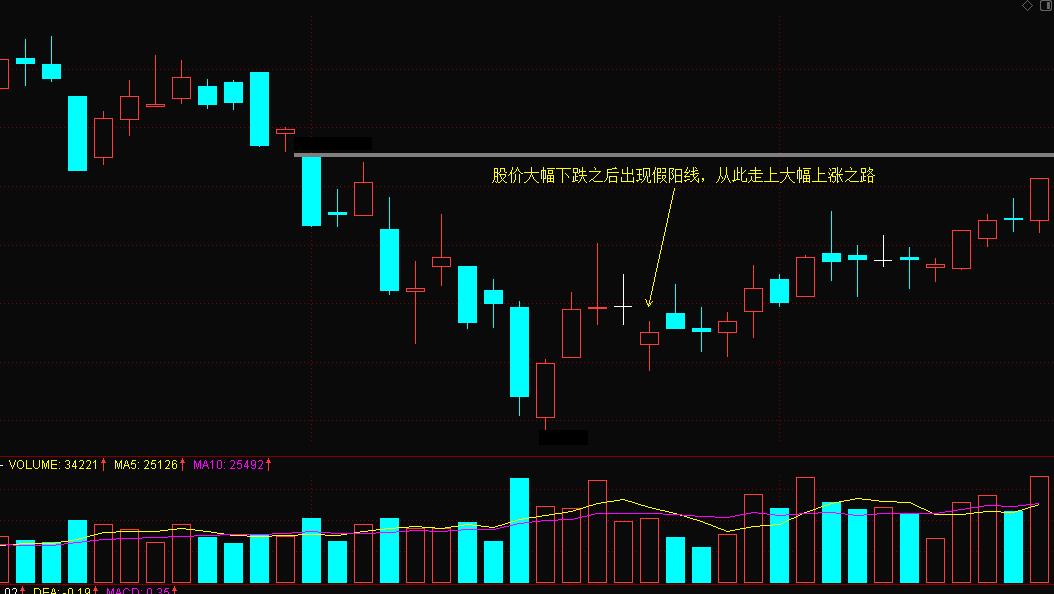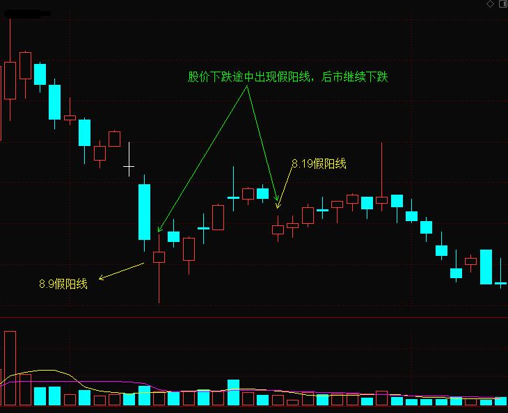 其形态本身表明多方逐渐扭转劣势,盘中股价由下跌转为上升,不过力量还是比较薄弱,否则也不会留下跳空缺口。假阳线都是在股价大幅下跌后被多方拉回,显示多方强大的实力。出假伪阳线,后市继续上涨的可能性非常大,也是许多短线投资者在当日大幅度低开后进场抢反弹的指示信号之一。在股价的实际走势中,我们还是要结合假阳线所处的位置,判定其市场意义。