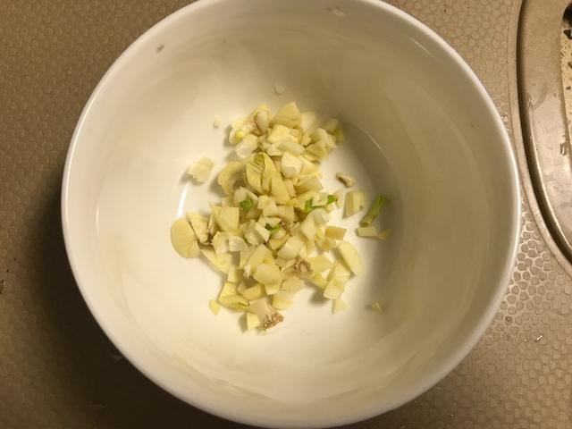 2、将大蒜剥皮以后拍扁剁碎蒜泥放进碗中预留。
