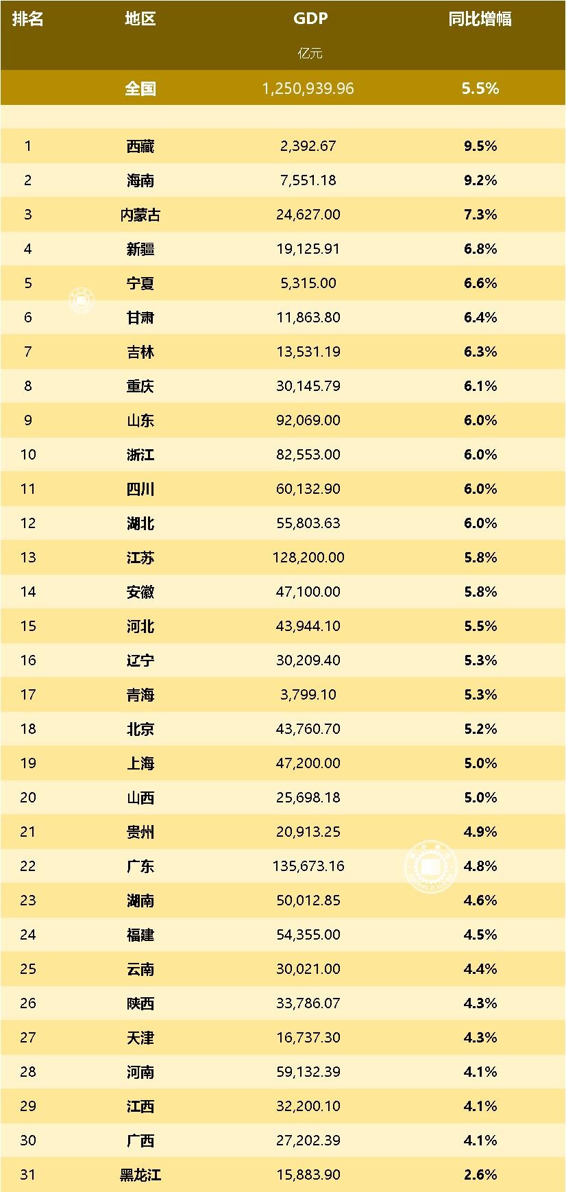 2023年度全国GDP增幅最大的是西藏,9.5%;其次是海南,9.2%;排名第三的是内蒙古,7.3%;增速最低的是黑龙江,只有2.6%。
