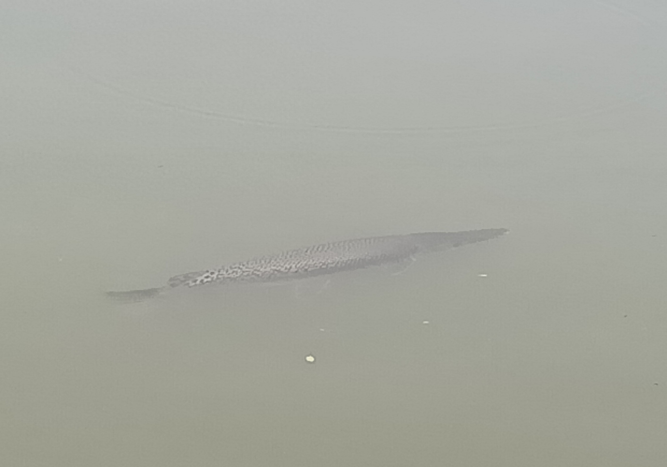7日上午,记者来到位于开福区的农庄现场,农庄总经理黄女士介绍了当时的情况。“事件发生在4月30日,工作人员在环湖巡查过程中,在湖中小岛旁发现一只形似木头的生物,其外貌细长,当时一动不动,用石头扔过去,发现有轻微游动,才看出是一条鱼。”黄女士表示,这条怪鱼从外形到行为,与他们在水塘中投放的鱼差别很大。“我们估计这条鱼的长度在一米到一米二之间,我们根据它的外形搜索,认为这是一条鳄雀鳝。”黄女士向记者展示先前拍到的照片,记者看到,这条鱼鱼身细长,全身长满花纹。