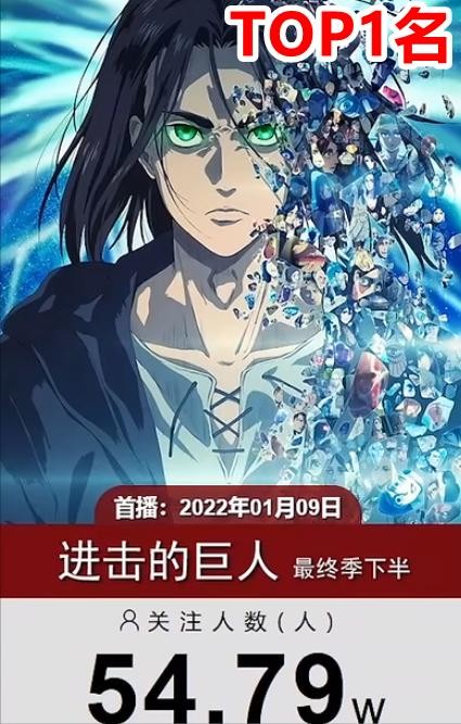 1:《进击的巨人》(最终下半),漫画与动画还是有时间差的,它的关注人数约为54.79万上下。