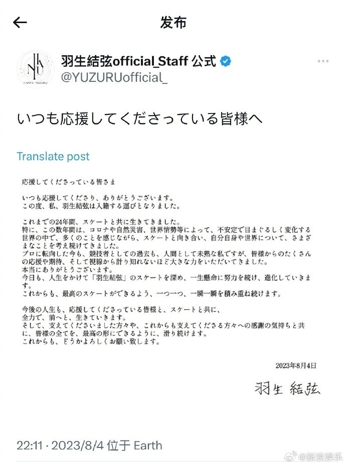 羽生结弦通过工作室发文,并称:“在今后的人生中,我也会和支持我的大家一起,和滑冰一起,全力前进。” 这位比赛收视率胜过当年日本首相竞选直播的滑冰运动员,势必一出场就是占据国内外各大热搜榜的存在。