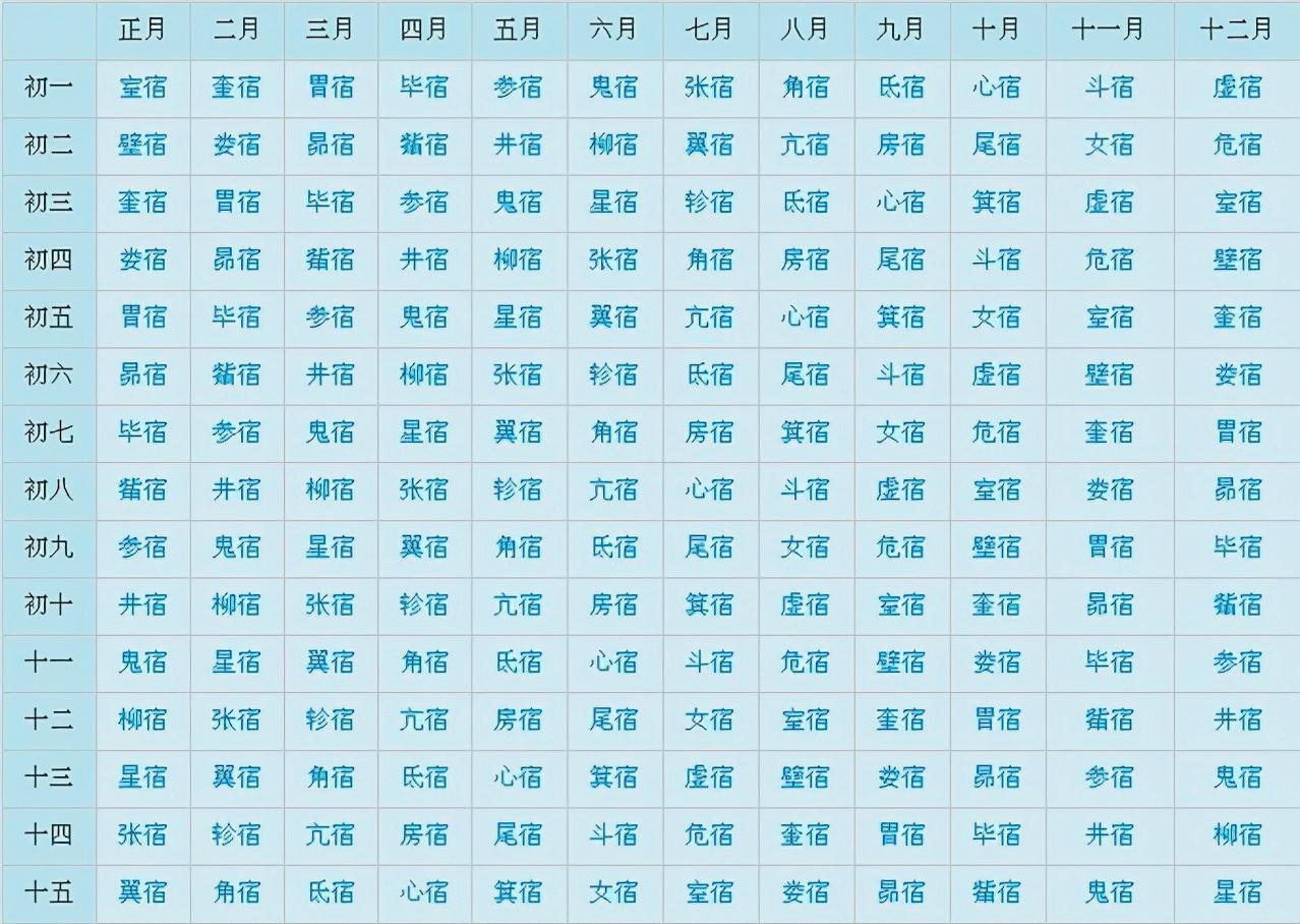 农历正月十七、二月十五、三月十三、四月十一、五月初九、六月初七、七月初四、八月初一、八月廿八、九月廿六、十月廿四、冬月廿一、腊月十九出生,星宿即属角木蛟。