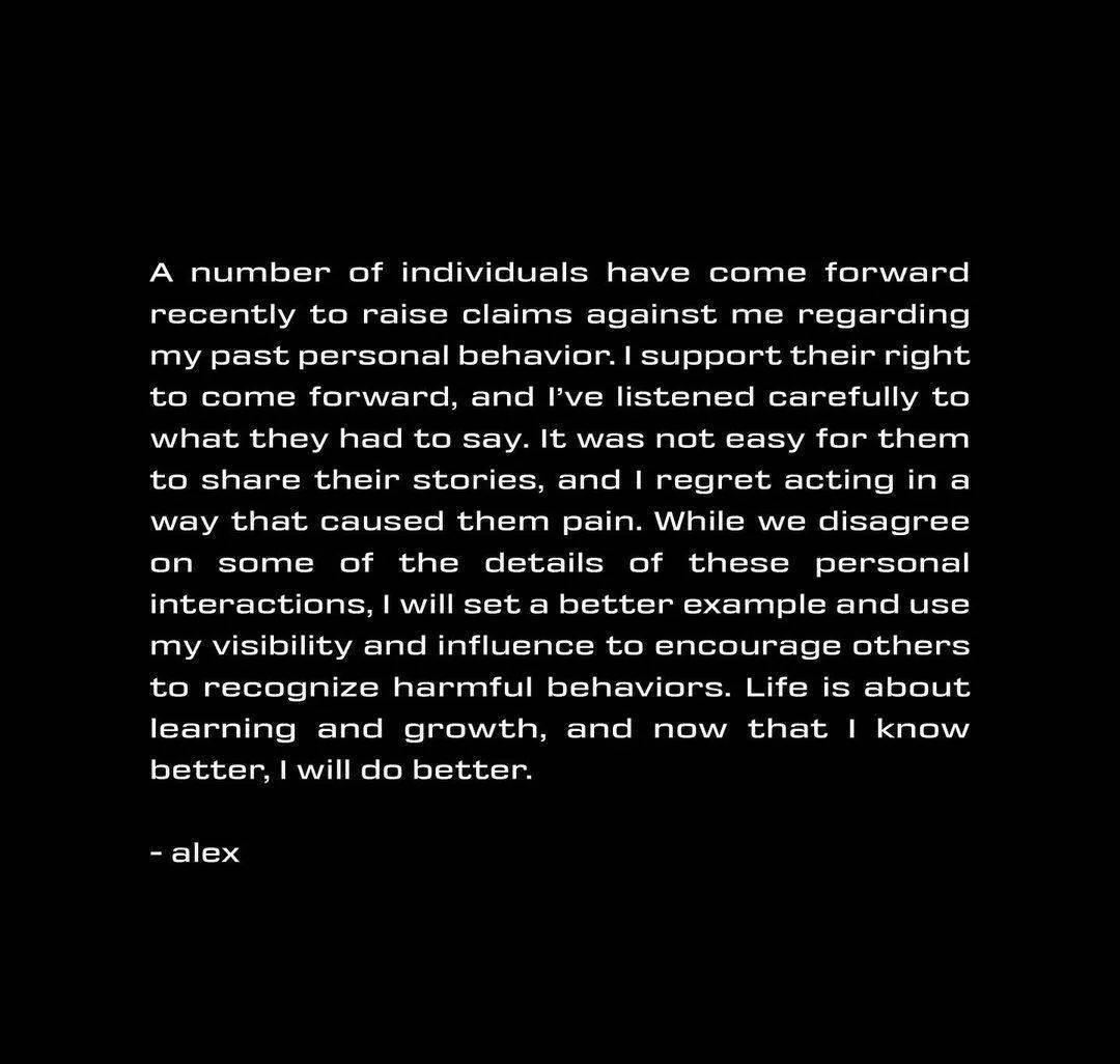 “最近,很多人站出来指责我过去的个人行为,我支持他们发声的权利,认真倾听他们的观点。他们分享自己的故事并不容易,这种行为让他们痛苦,我也很伤心。”“我深感遗憾。虽然我们在这些个人互动的细节上存在分歧,但我将来一定会打造一个更好的榜样,并利用我的知名度和影响力来鼓励其他遭受苦难的人站出来反对坏人。”