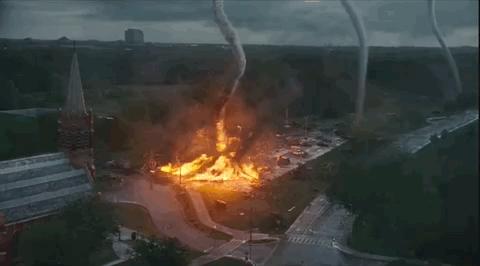 由于汽车爆炸起火,龙卷风刮过来迅速形成了一个火龙卷,堪称地狱般的景象。