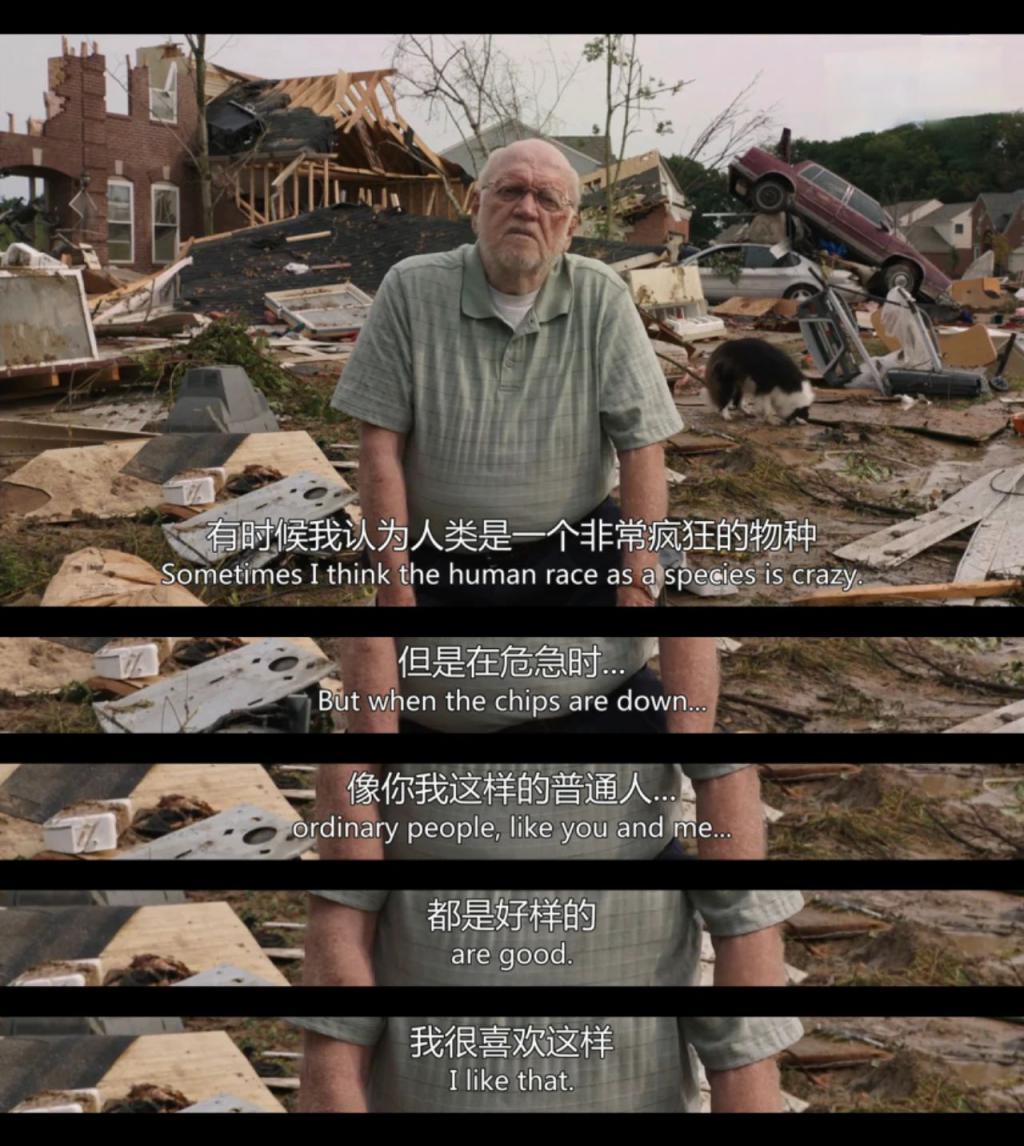 再看影片结尾,需要重建家园的人们面对采访镜头。