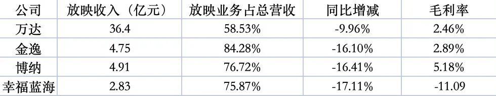 而其余放映业务占比高于六成的院线公司,也遇到放映业务的萎缩。其中幸福蓝海情况更为窘迫,总体净利润下跌 724.24%,亏损 0.297 亿。而放映板块的收入,毛利率为 -11.09%。电影院不仅仅是难赚钱,更滑向了亏钱的一端。