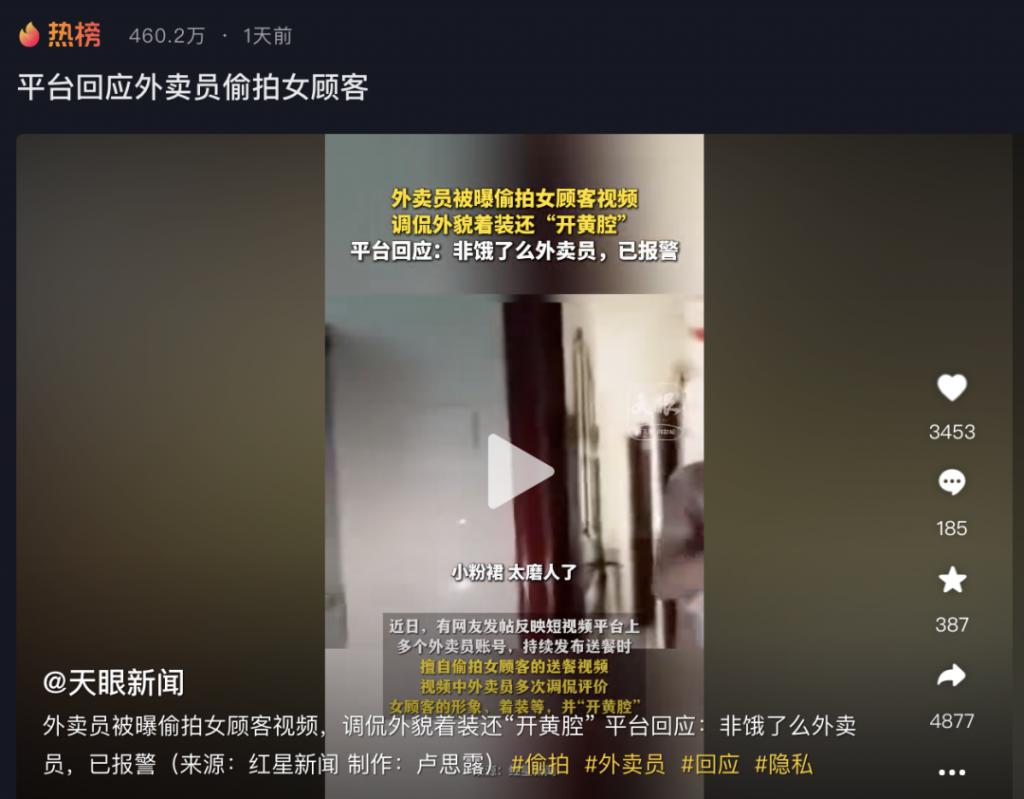 前两天看到新闻,某平台外卖员送餐时,偷拍女顾客,开黄腔配低俗文字发网络。