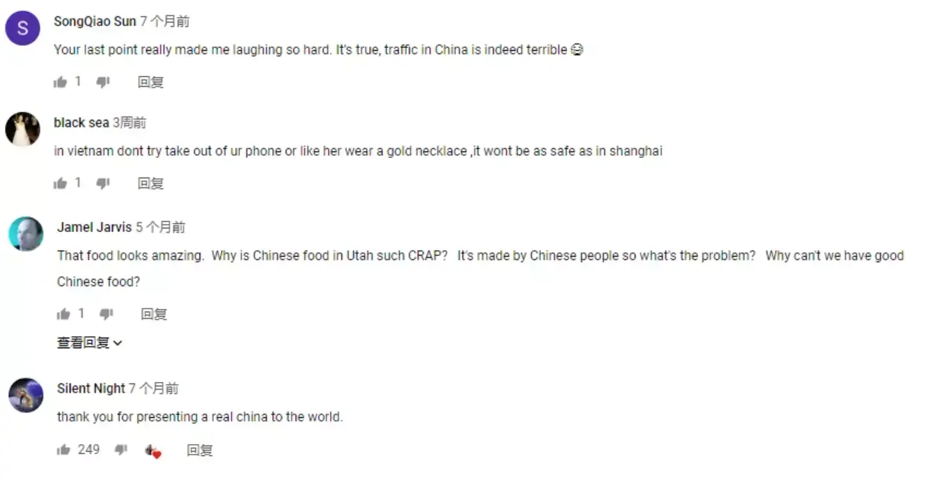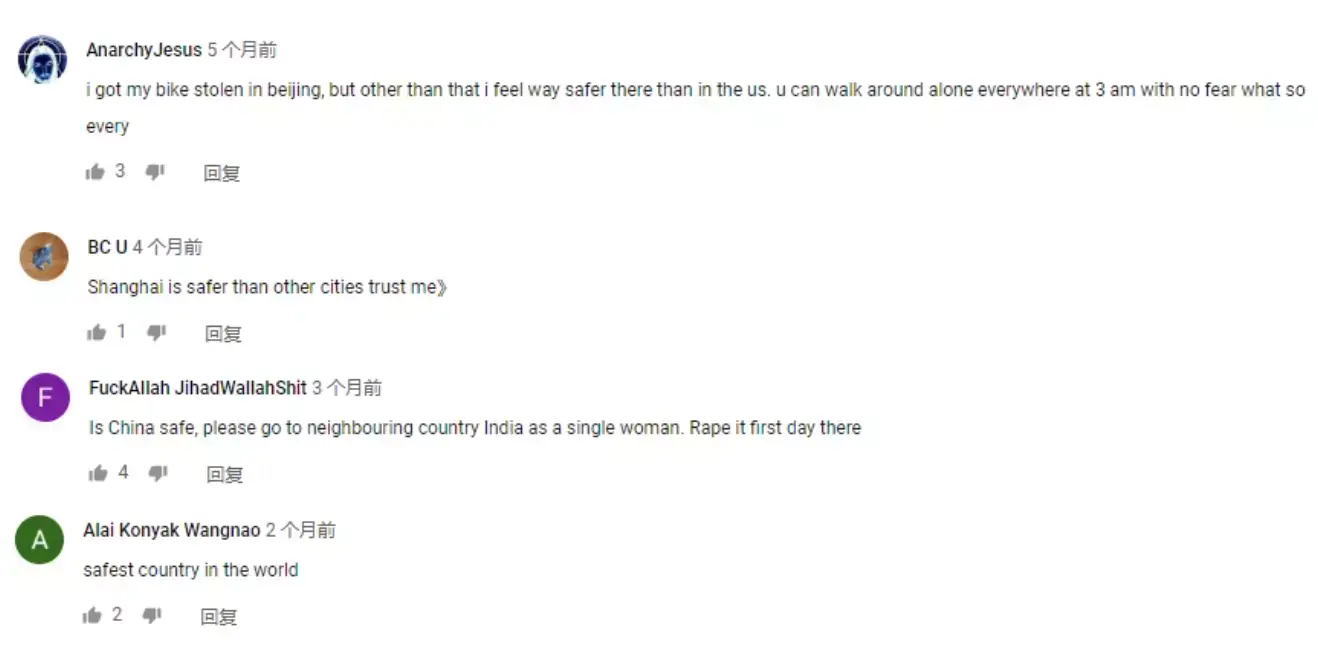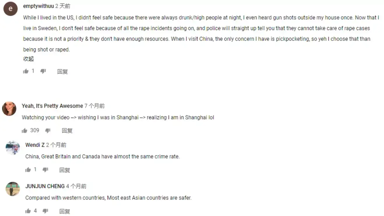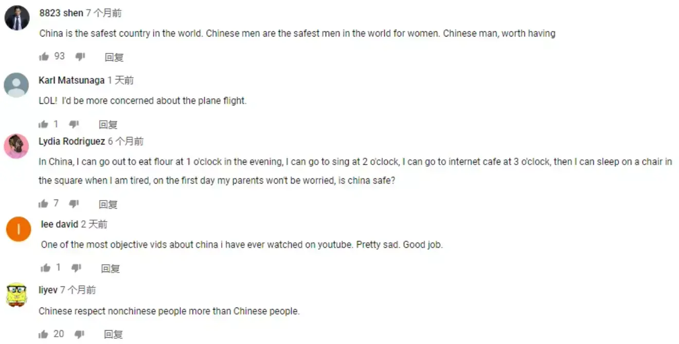 对此,小玩子一方面感激有外国友人不带偏见地向外网展示中国真正面貌(毕竟外网对我们的误解挺大),另一方面也对该条视频的评论区里其他外国人对此问题的看法很感兴趣,故特将此事关“中国是否安全”的外网评论,分享给在座的你们。(图片为翻译原本,嫌麻烦的亲可以直接查看下方的文字翻译哟)