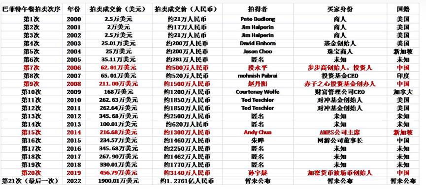 最后一次午餐拍卖结束,历时23年时间的巴菲特午餐今天正式完美收官,1900万美元(约1.28亿人民币),刷新了成交纪录。