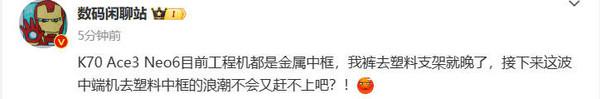 【手机中国新闻】9 月 26 日,手机中国注意到,根据消息人士的爆料,Redmi K70、一加 Ace 3、realme 真我 GT Neo6 等性价比机型很有可能会放弃使用塑料中框,转而开始使用金属中框。据悉,接下来中端手机市场上将会掀起一波去除塑料中框的浪潮,无数消费者或许将因此受益。