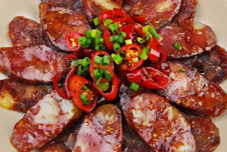 腊肠清洗处理好,切成片,码在盘中;生姜洗干净后切成片,把生姜片放在生的腊肠上。往放置腊肠的碗中倒一小勺老酒。蒸锅中倒水,放入架子,将盘子放在架子上,然后盖好开始隔水蒸。大火蒸大概30分钟。蒸熟后将腊肠上的生姜祛除,因为蒸的时候生姜已经入味了,所以不需要再放了。