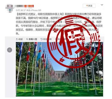 文章还有板有眼地引用:据俄罗斯《消息报》8月31日报道,包括普京等众多国家领导人向联合国秘书长等组织提出请求,将联合国总部从美国迁至中立国家。据俄新社1日报道,俄国家杜马副主席近日建议将联合国总部从纽约迁往中国。