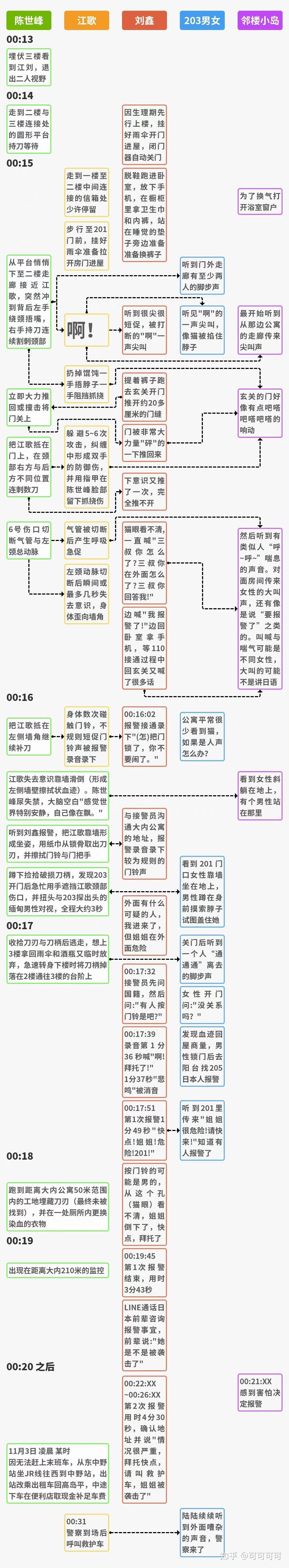 00点13分 刘、江返回住所处一楼,刘表示月事弄脏了裤子要赶紧回去换裤子(真实动机存疑),江表示让其先上去,她去查看一下信箱