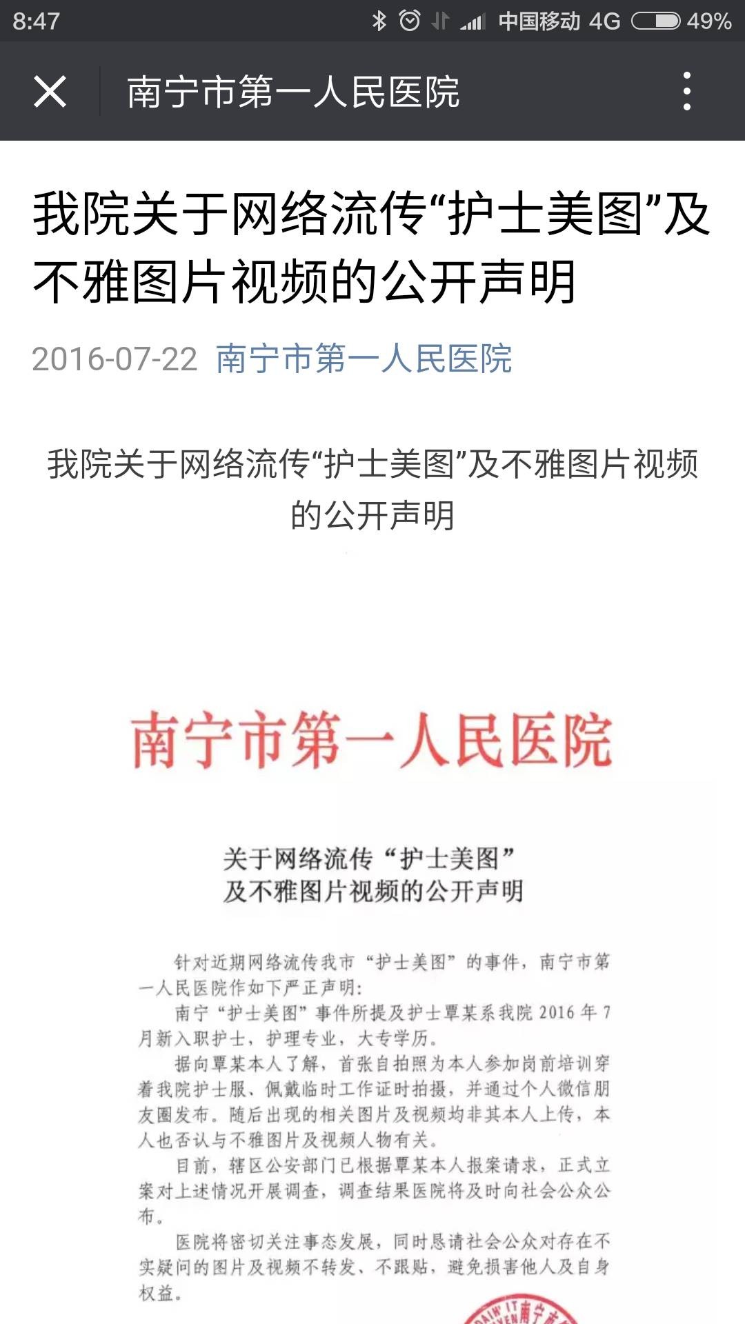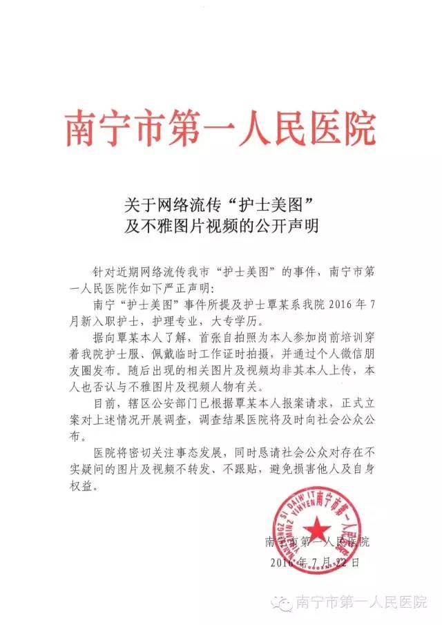 “南宁市第一人民医院”微信公众号在昨日下午发布了题为《我院关于网络流传“护士美图”及不雅图片视频的公开声明》。