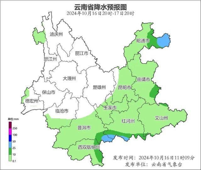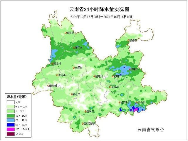 10月16日20时至17日20时:昭通市东部、红河州南部、普洱市东南部阴有中到大雨局部暴雨,昭通市西部、曲靖市、昆明市、文山州、红河州北部、玉溪市、普洱市南部、西双版纳州、临沧市南部、怒江州北部、德宏州西部多云有阵雨局部中雨,其他地区多云。