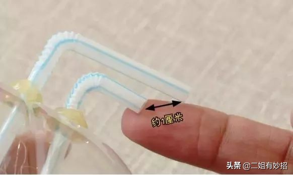 用剪刀把吸管剪断,上面的一根吸管要长一点,跟底部齐平,下面的吸管短个1厘米左右。
