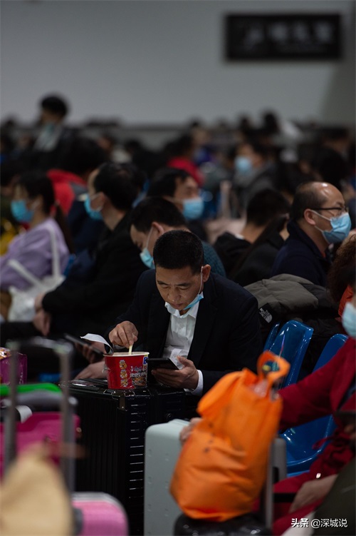 2022年春运,深圳西站,在候车室吃泡面的旅客。