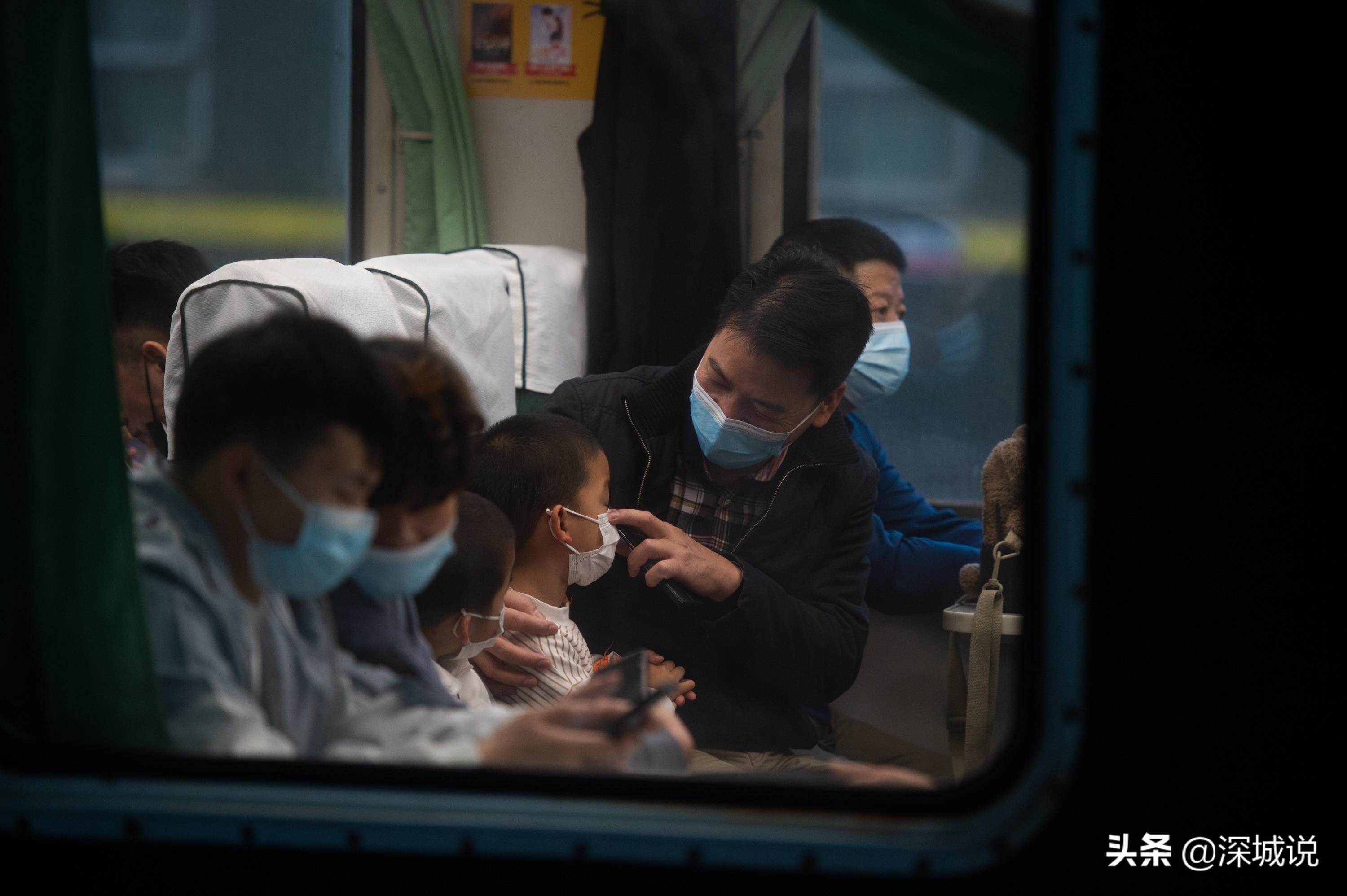 2022年春运,深圳西站,车窗内,父亲帮儿子将口罩压紧。