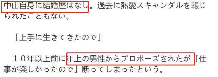 回到家乡后,中山忍沉迷工作,再也没有跟异性传出过绯闻,甚至扬言终身不嫁。