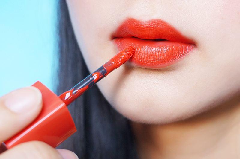Step2,将唇釉涂一层,然后用手指点均匀,这样颜色会自然些而且更持久。注意一定只能用手,不能用刷子等工具,否则会越涂越难看,就先用自带的海绵头点在嘴巴上,然后用手指就好 就是由嘴角向唇心轻轻的涂抹。