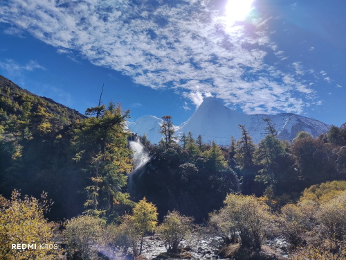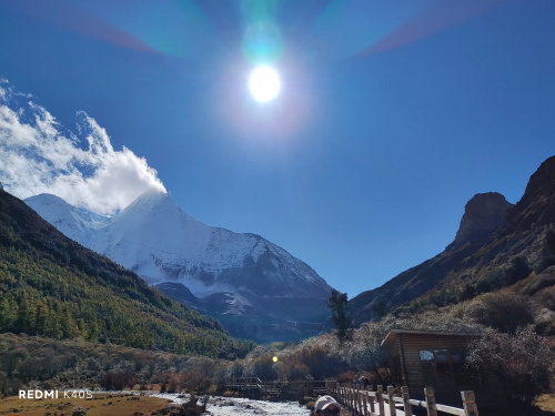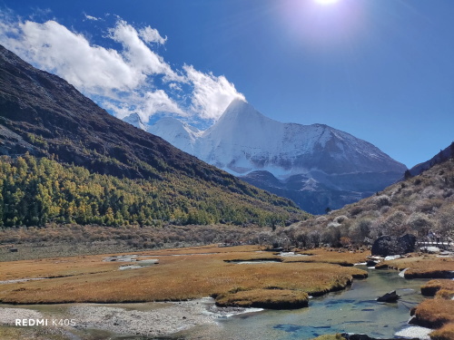 我们一直向南走,视线中始终出现的是南峰央迈勇,下午2点多的时候,太阳正好游弋到央迈勇上空,从地面望上去,神山距离太阳也就一百米的样子。那是一幅无法描述的壮丽景象,雪白起伏的神山,在正午秋阳的映照下,金光闪烁,晶莹夺目,无比辉煌。那是太阳神和雪山神的珠联璧合,联袂出演,是人世间罕见的奇景。